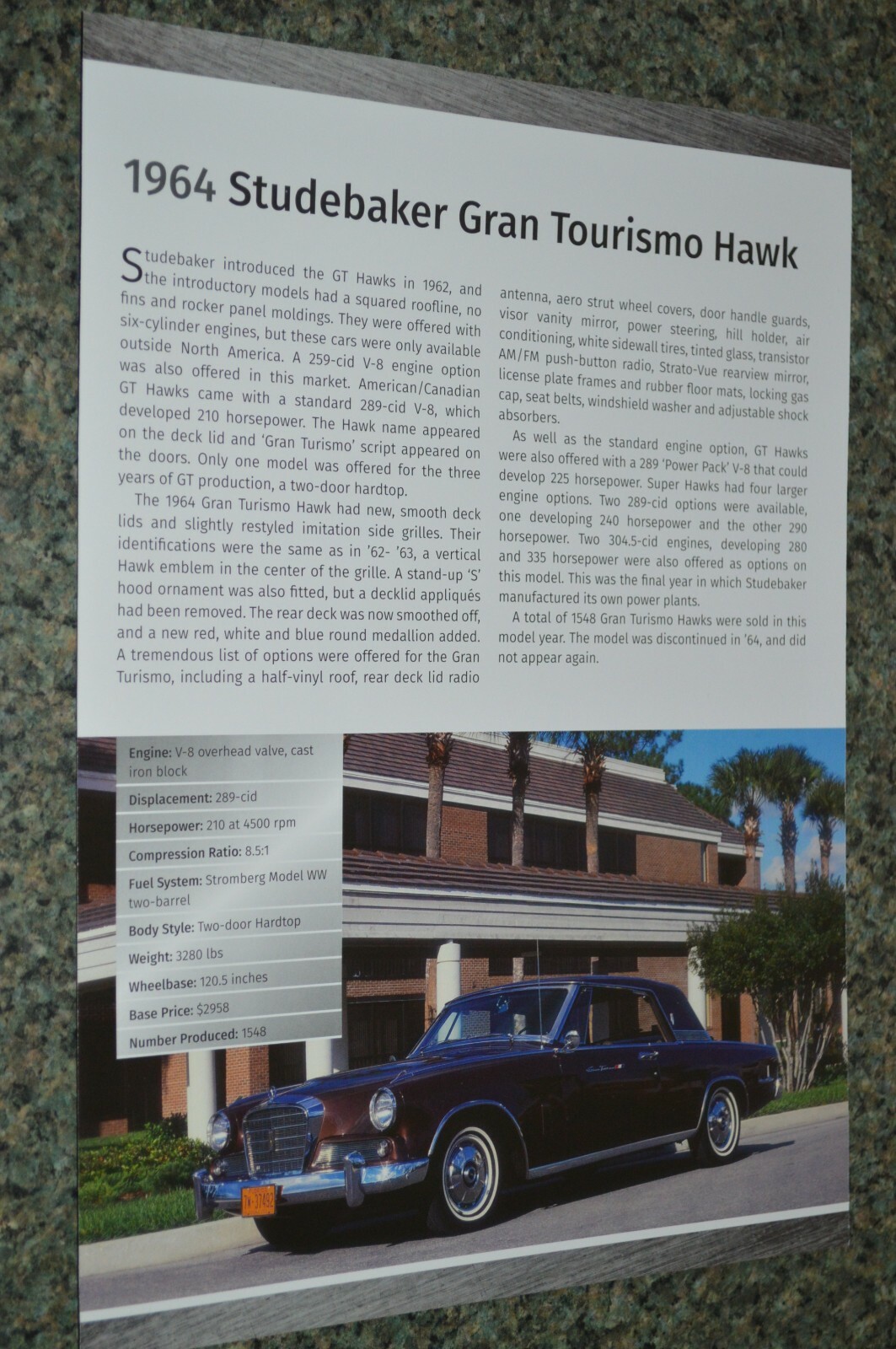 1964 STUDEBAKER GRAN TOURISMO HAWK. This Beautiful Full Color Spec Sheet has Factory information and outstanding photography! It is in excellent condition and was removed from an older, very rare, & expensive auto book.