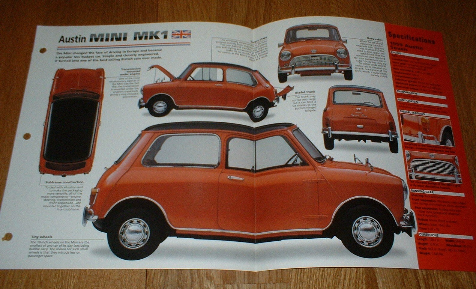 1959 AUSTIN SEVEN MINI MK1. collector brochure by IMP. This amazing full color brochure includes four pages of the vehicle's vital statistics. Even shows head to head comparison to their rivals and its original price.